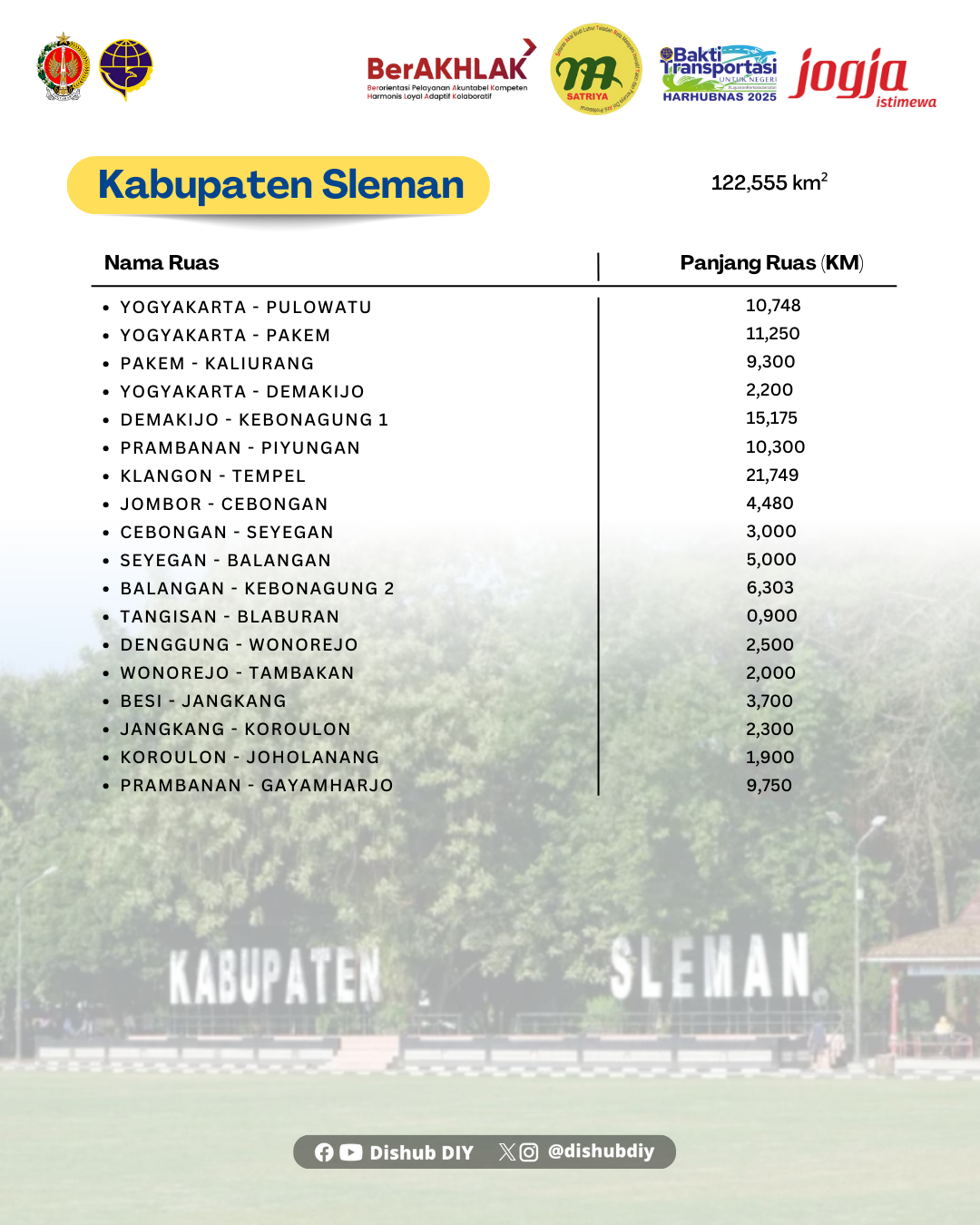 Pemerintah Daerah Daerah Istimewa Yogyakarta (DIY) mengelola ruas jalan provinsi sepanjang ±674 km. Status jalan ini ditetapkan melalui Keputusan Gubernur yang diperbarui sedikitnya lima tahun sekali. Penetapan terbaru tercantum dalam Keputusan Gubernur Nomor 41/KEP/2023, dengan rincian sebagai berikut: