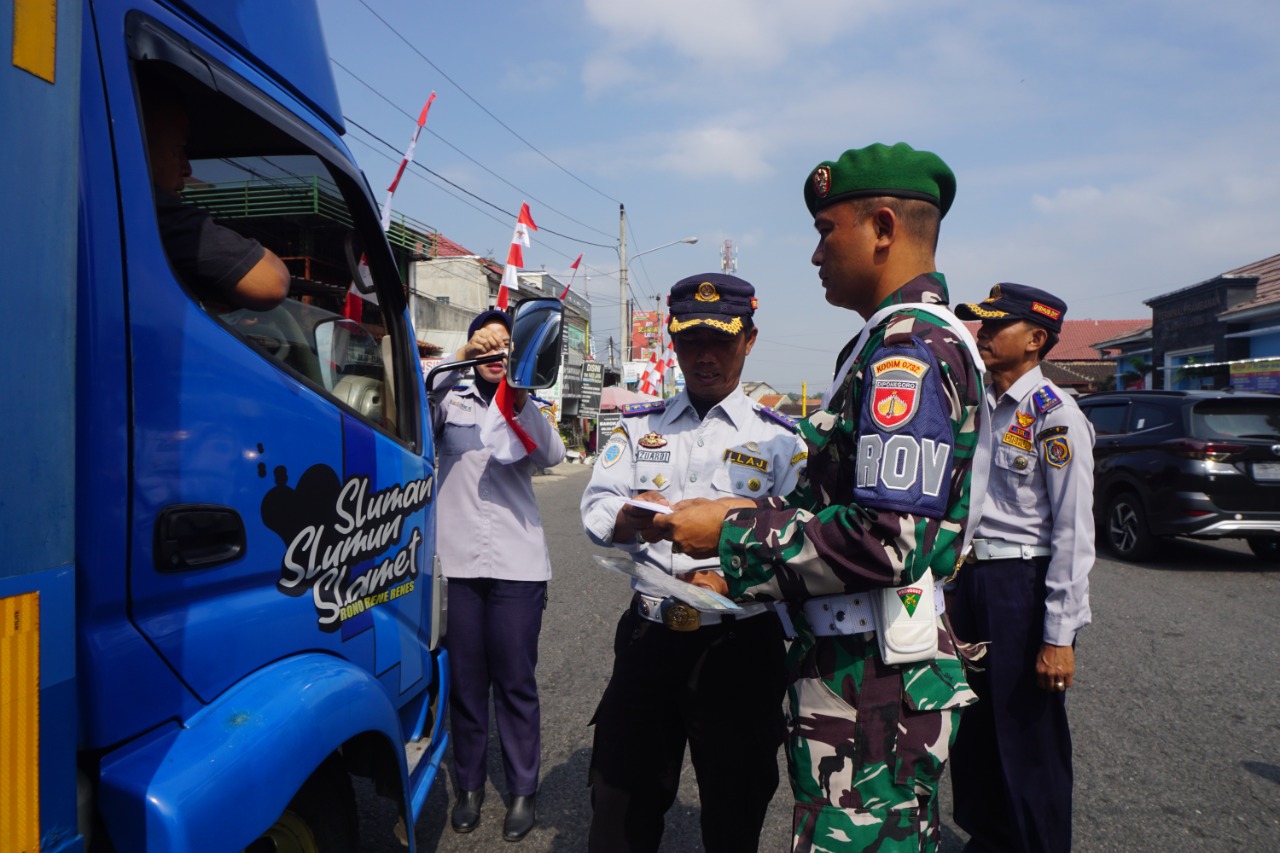 Sleman — Semangat kemerdekaan turut menyala dalam kegiatan Penegakan Hukum (Gakkum) Lalu Lintas dan Angkutan Jalan (LLAJ) yang digelar di Kabupaten Sleman pada Rabu (6/8) di Kapanewon Tempel dan Kamis (7/8) di Kapanewon Prambanan. Tidak hanya melakukan pemeriksaan kendaraan, petugas juga menyemarakkan nuansa merah putih dengan memasang dan membagikan bendera pada sejumlah kendaraan angkutan jalan.